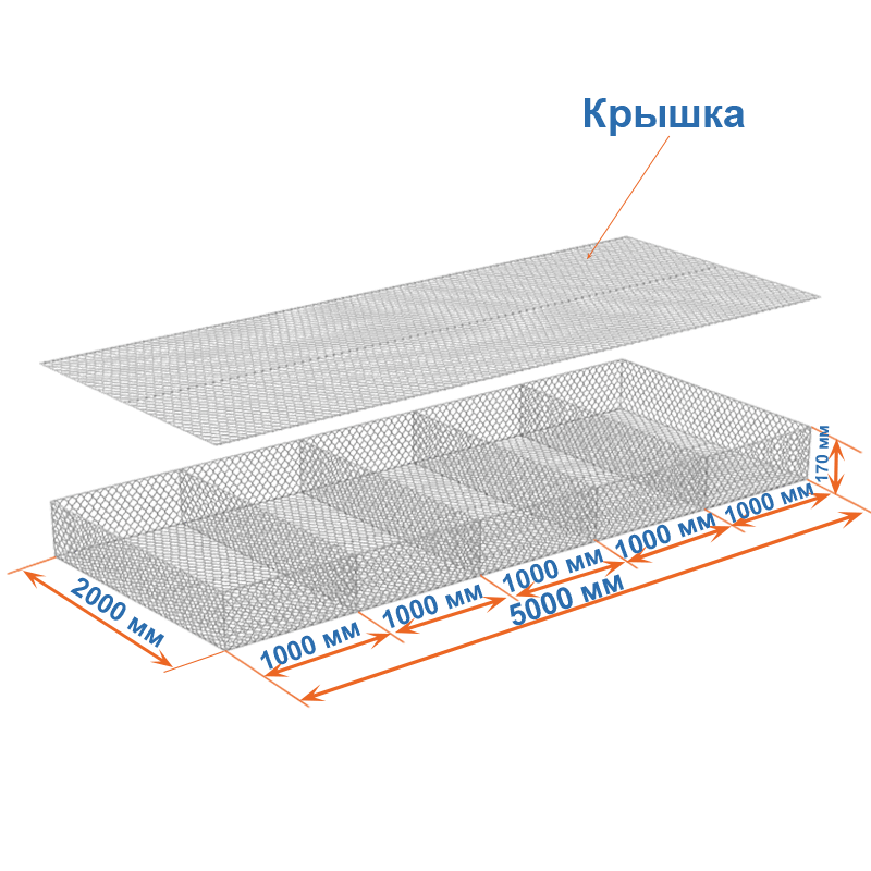 Матрасы Рено 5x2x0,17 — плоские габионные секции из сетки двойного кручения с ячейкой 60х80, проволокой 2,2 мм и покрытием Цинк.